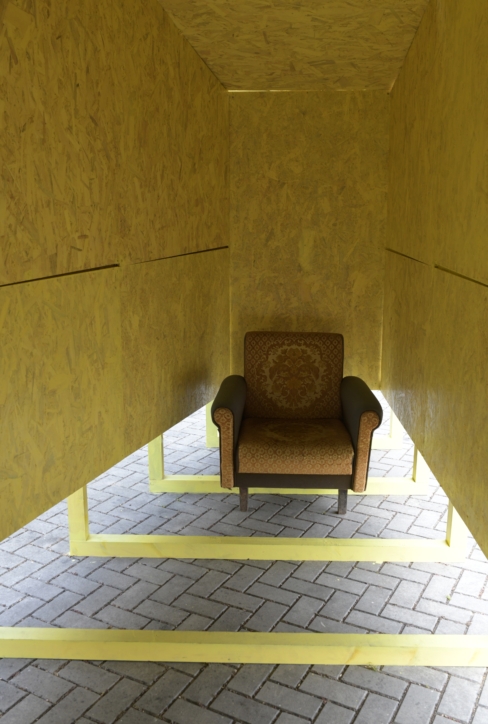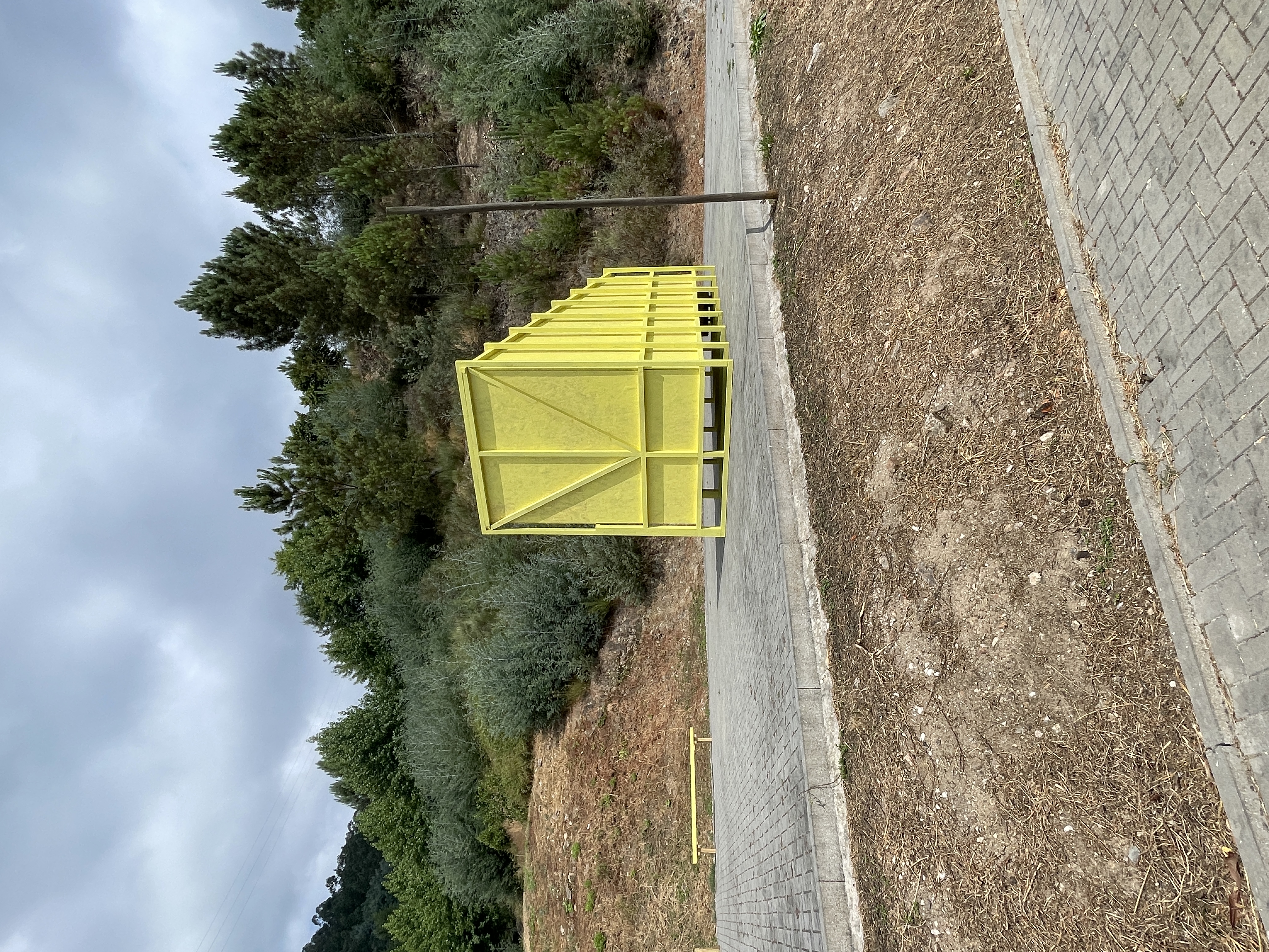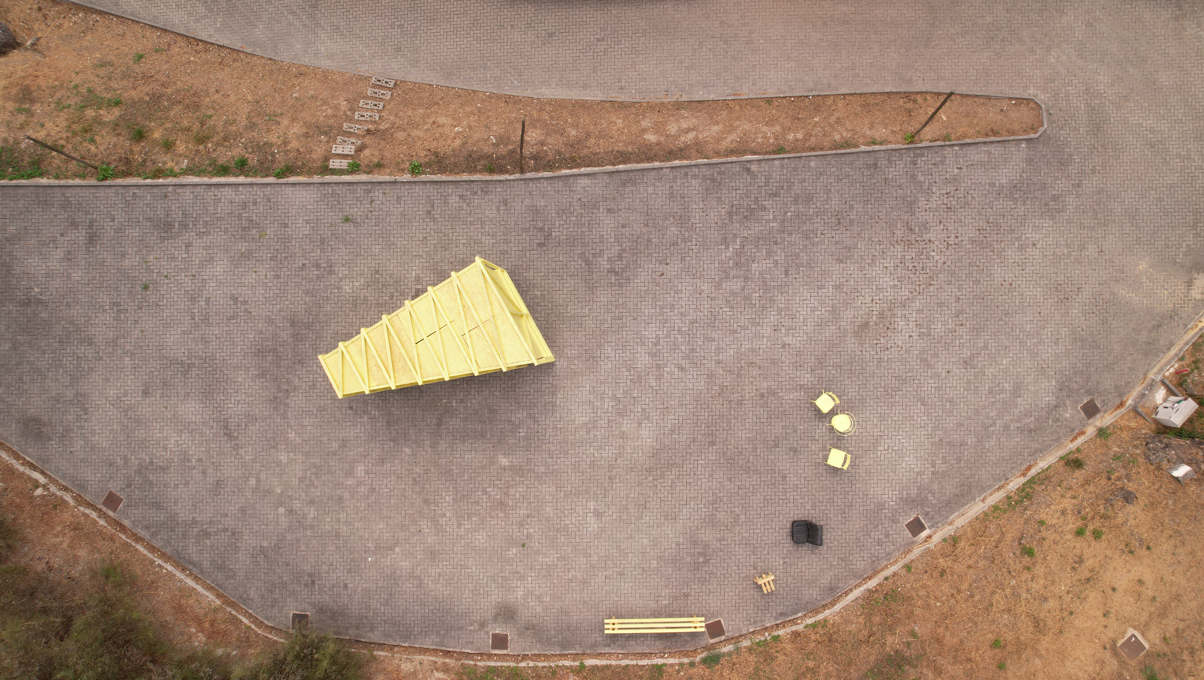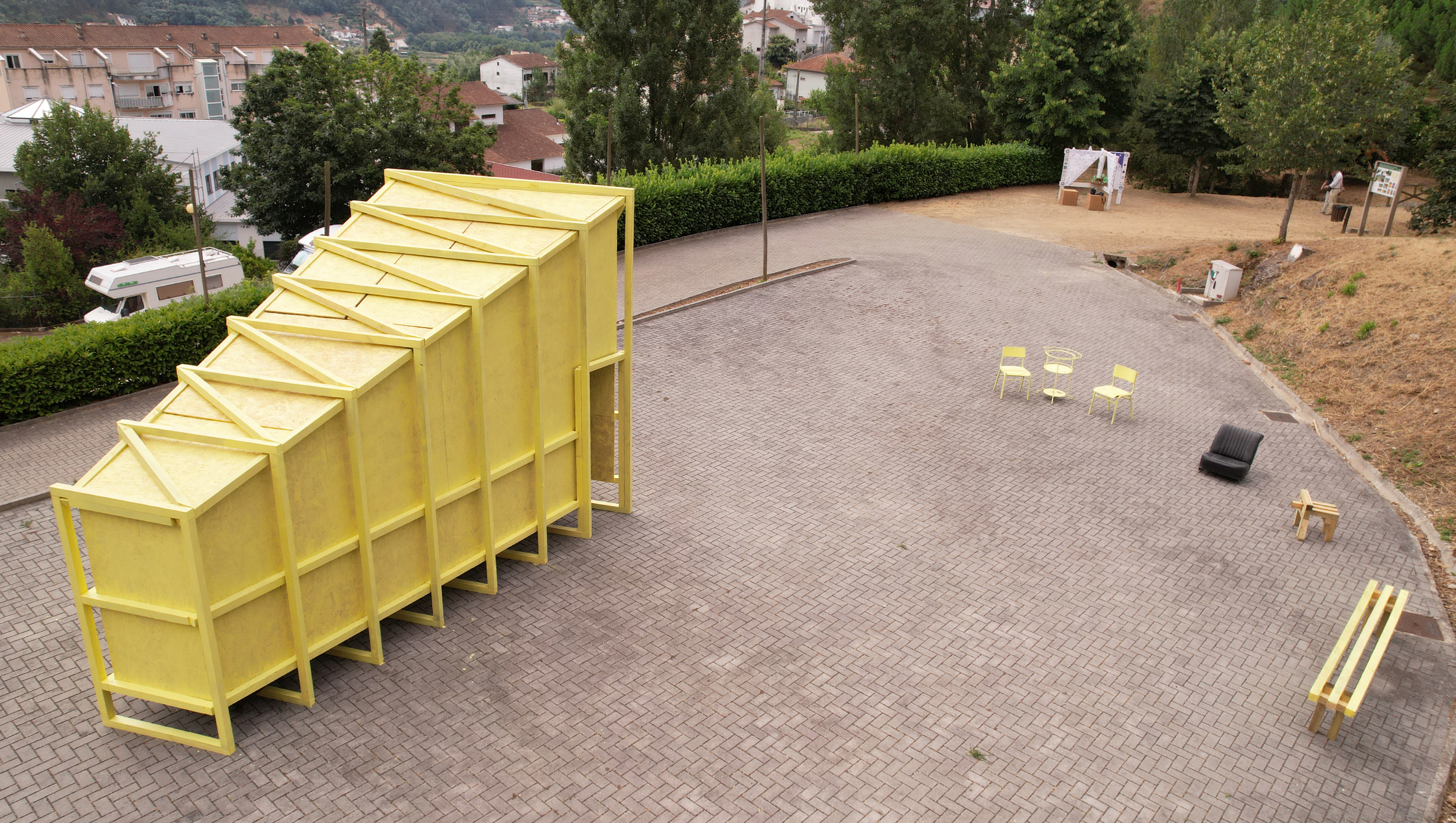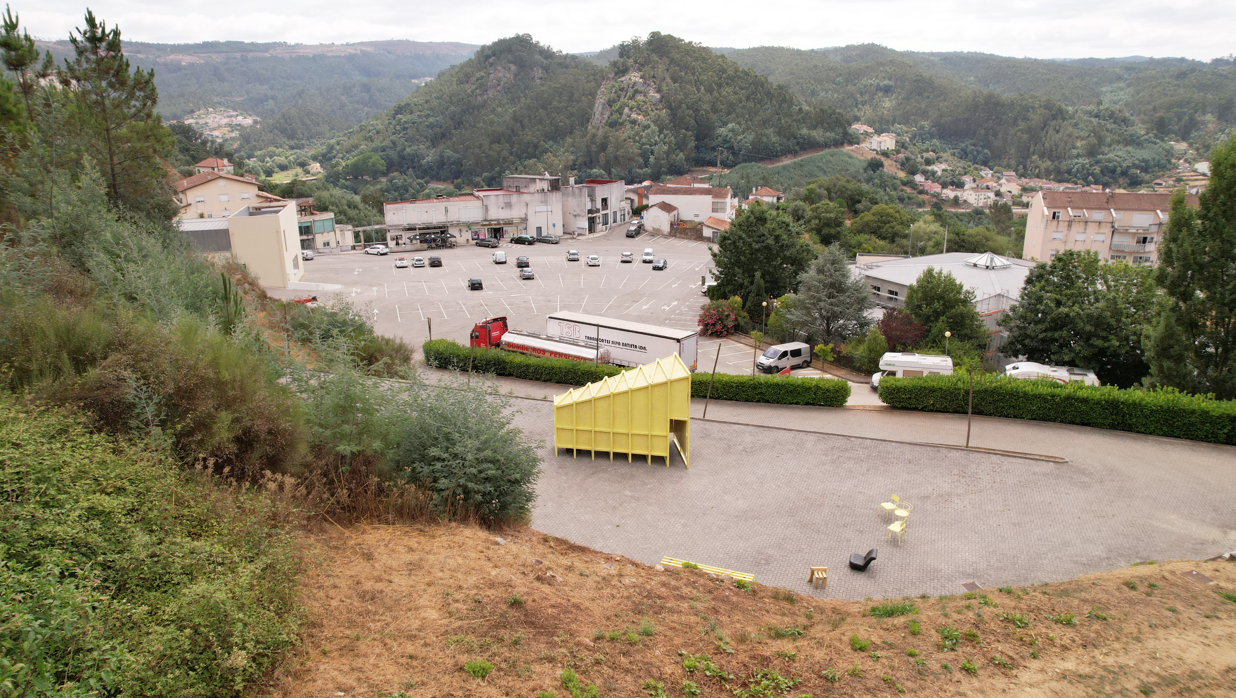 Segundo Vitorino Nemésio, que aqui comprou moinhos e uma mata, a razão de ser da fama de Penacova são os miradouros: o Penedo do Castro, a pérgola do Raul Lino, o mirante do Nicola Bigaglia, a pérgola do Jó das Bifanas. Lugares altos para admirar, as palavras são de Nemésio, “a luz e penedia”. Por estes dias de excesso de sol e luz e nesta cova entre penedos, propomos um anti-miradouro: contra a exterioridade, um lugar para a interioridade; contra a linha do horizonte, um ponto de proximidade; contra a luz, a penumbra. Esta obra foi projetada para o Parque Verde da vila de Penacova. Situado a meia encosta, numa área movimentada por feiras mensais, entre os edifícios do Centro de Saúde e dos Bombeiros Voluntários, o Parque Verde passa despercebido. É um espaço público subutilizado. Sem entrada sinalizada, carece de atenção. Na plataforma existente, a estrutura criada define-se por uma sucessão de anéis que diminuem gradualmente de tamanho, revestidos com placas de OSB, criando, assim, uma perspetiva forçada e uma sensação de compressão no interior. Como remate, um simples assento.Este espaço de contemplação é proposto para que os utilizadores possam experienciar calmamente todas as sensações proporcionadas pela peça. A mobília no exterior, reaproveitada do depósito de materiais da Câmara Municipal, é colocada em torno da estrutura, procurando organizar pequenos núcleos de conforto na plataforma inóspita. Pintado de amarelo, cor associada à alegria e criatividade, o anti-miradouro assume um outro propósito, marcando o acesso ao Parque Verde
