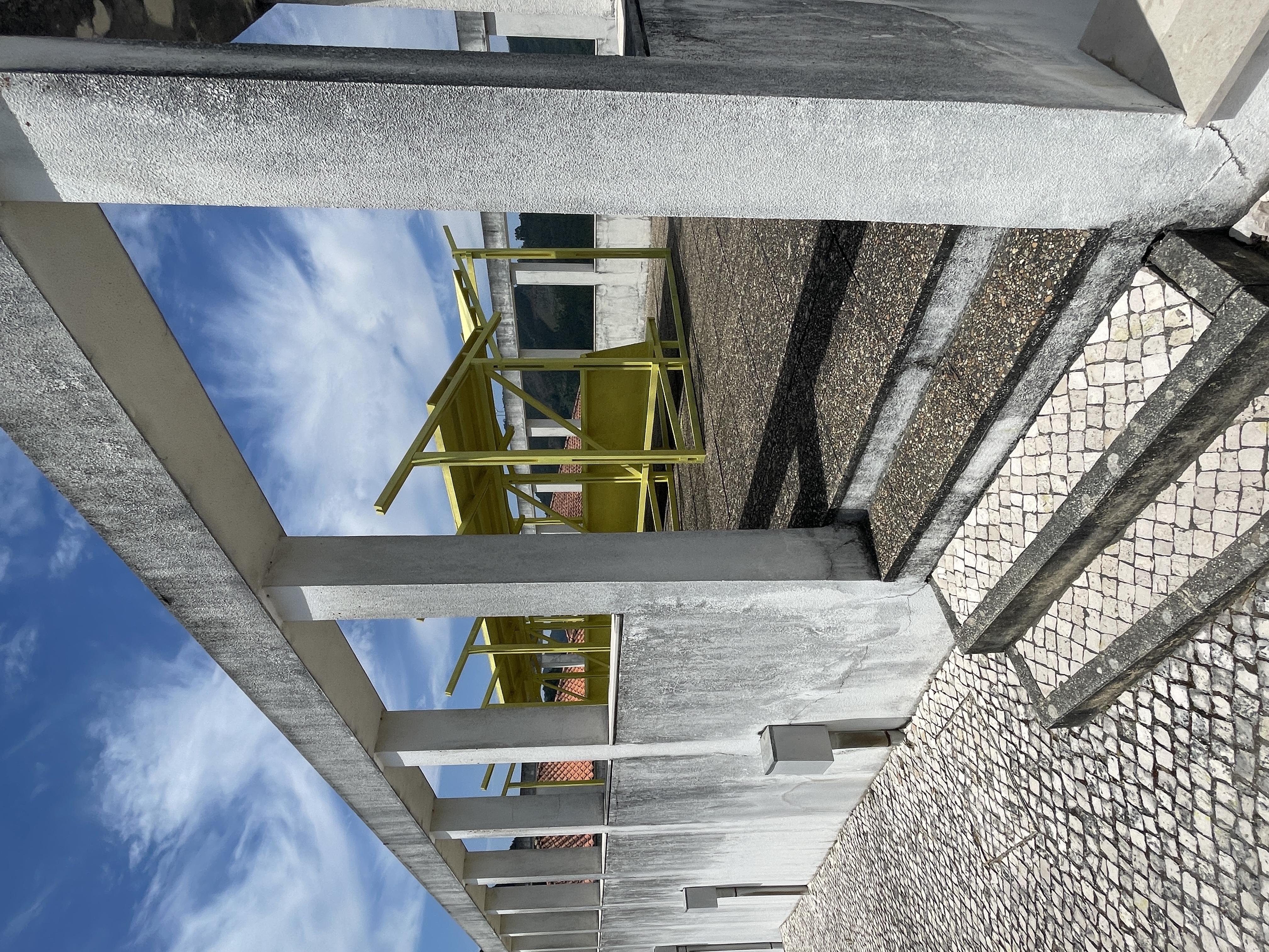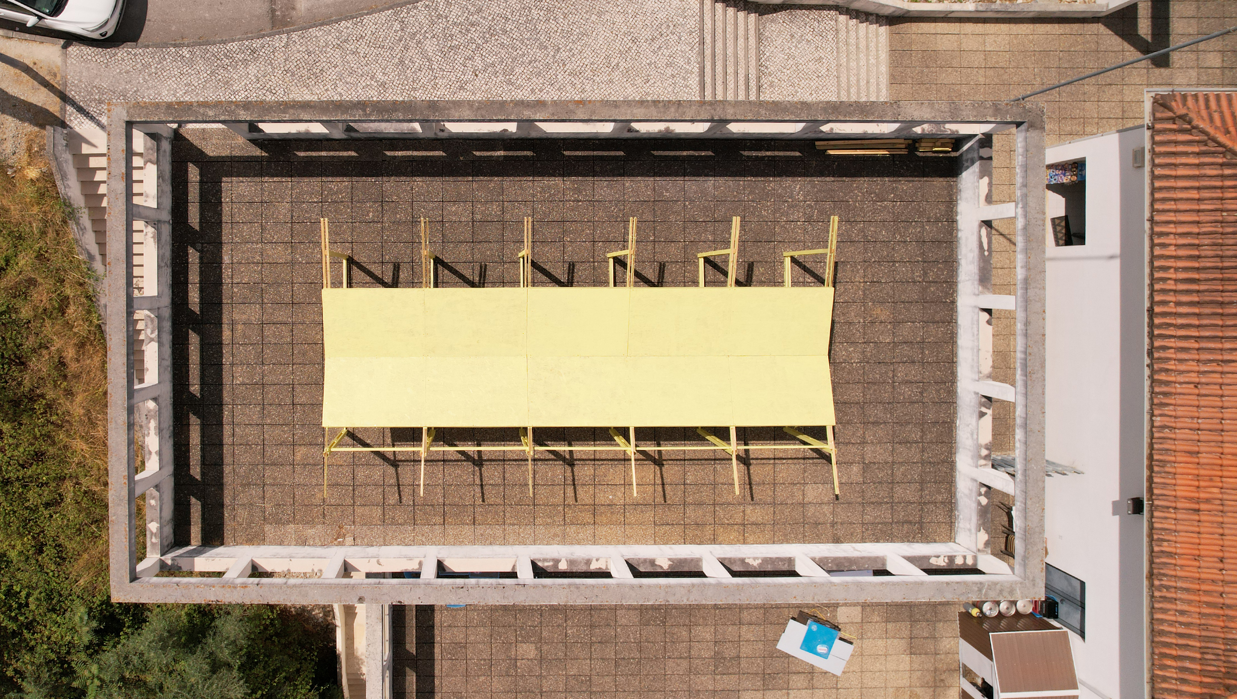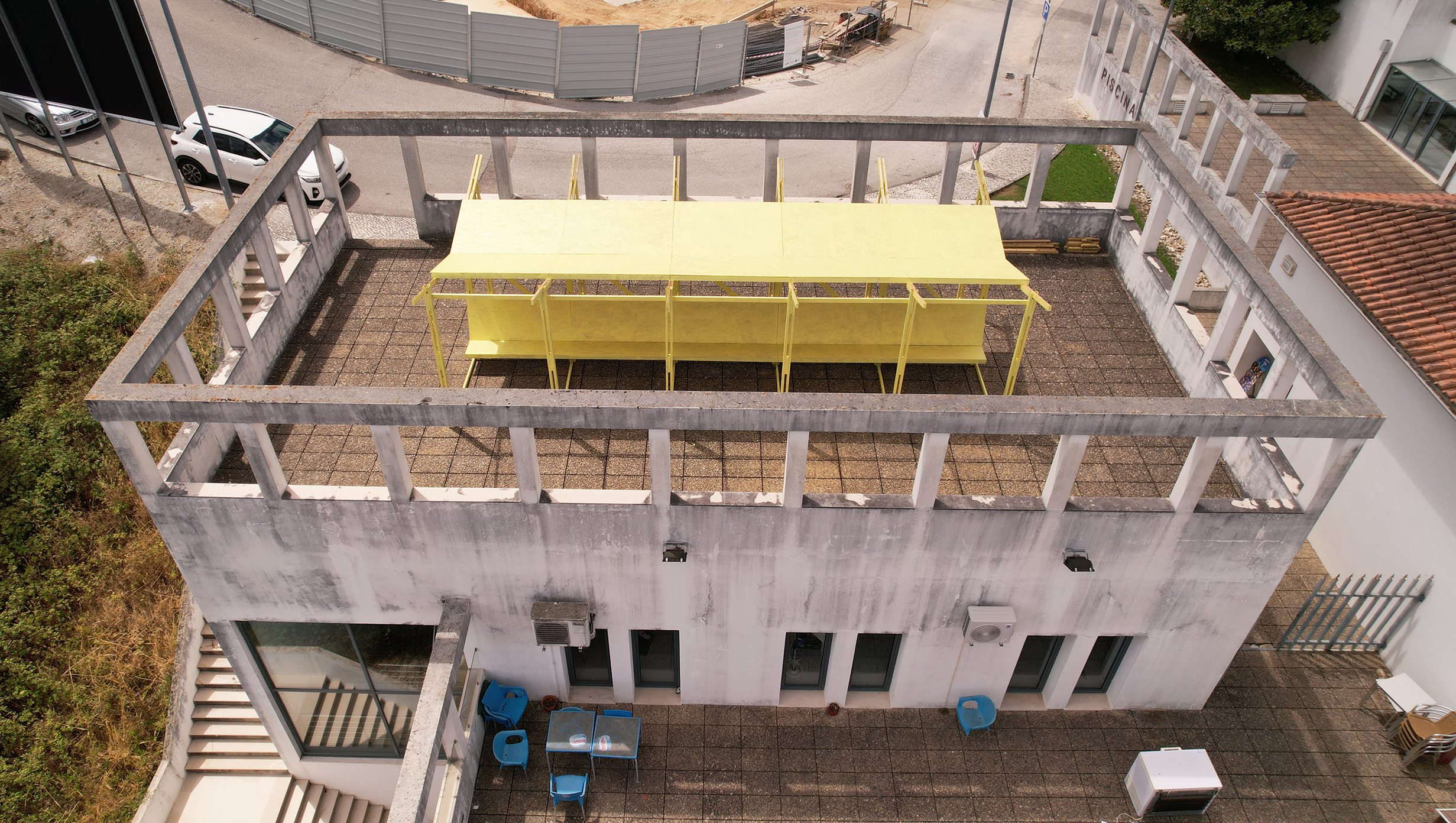 A estrutura desenvolvida, construída em madeira, assenta sobre um espaço preexistente que apresenta uma métrica rigorosa e bem delineada. Esta base impôs uma lógica construtiva clara, que não foi encarada como uma limitação, mas, antes, como uma oportunidade para criar um diálogo entre o novo e o existente. A peça nasce, assim, do respeito por este ritmo e dessa modulação arquitetónica, que se tornam parte integrante do novo gesto construtivo. Ainda assim, a intervenção distingue-se pela liberdade formal com que se desdobra, permitindo a criação de um espaço simultaneamente contido e fluído, com vocação múltipla e identidade própria. Essa liberdade programática garante à estrutura uma capacidade de adaptação que a torna viva e responsiva às diferentes formas de apropriação ao longo do tempo.