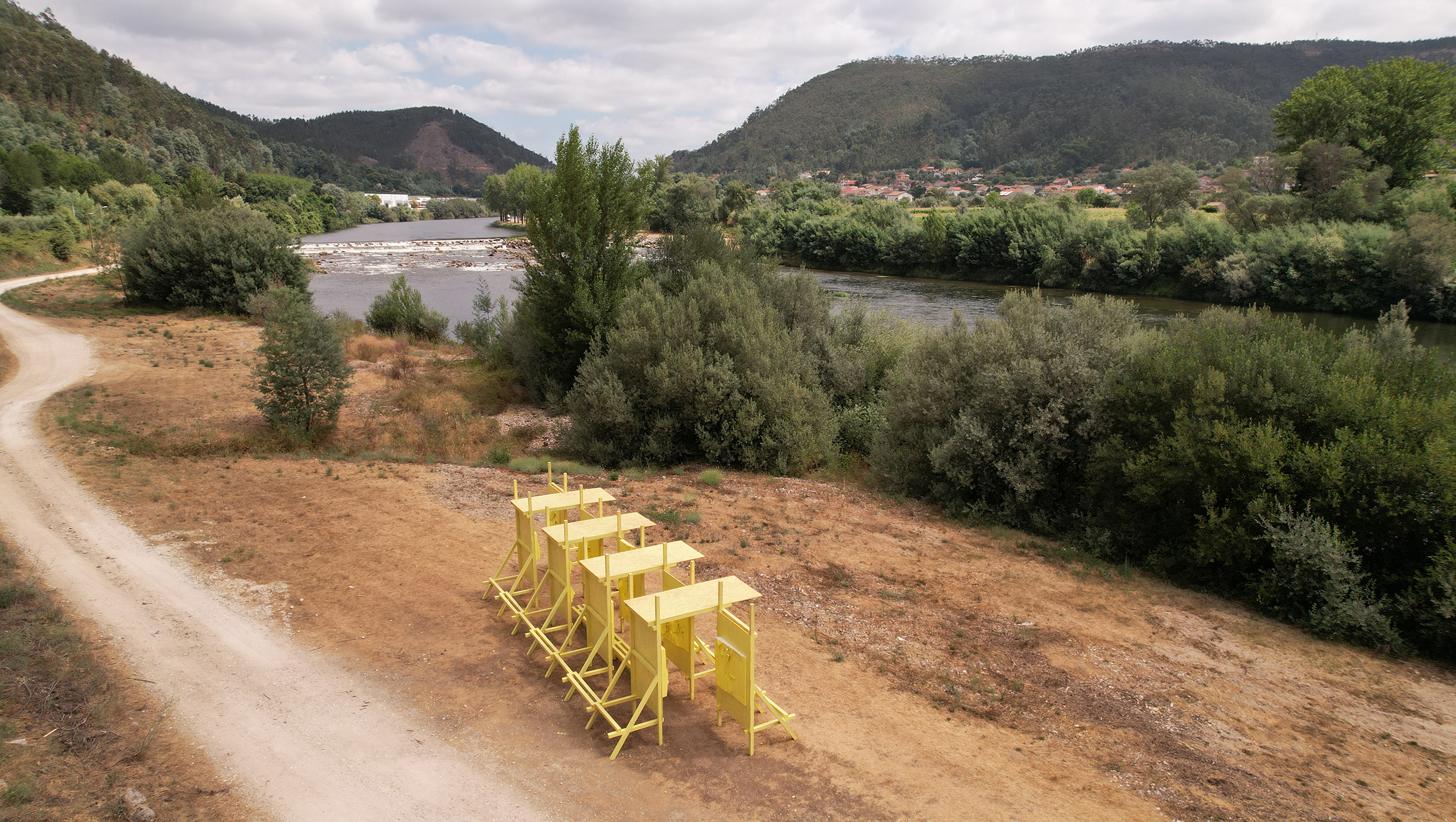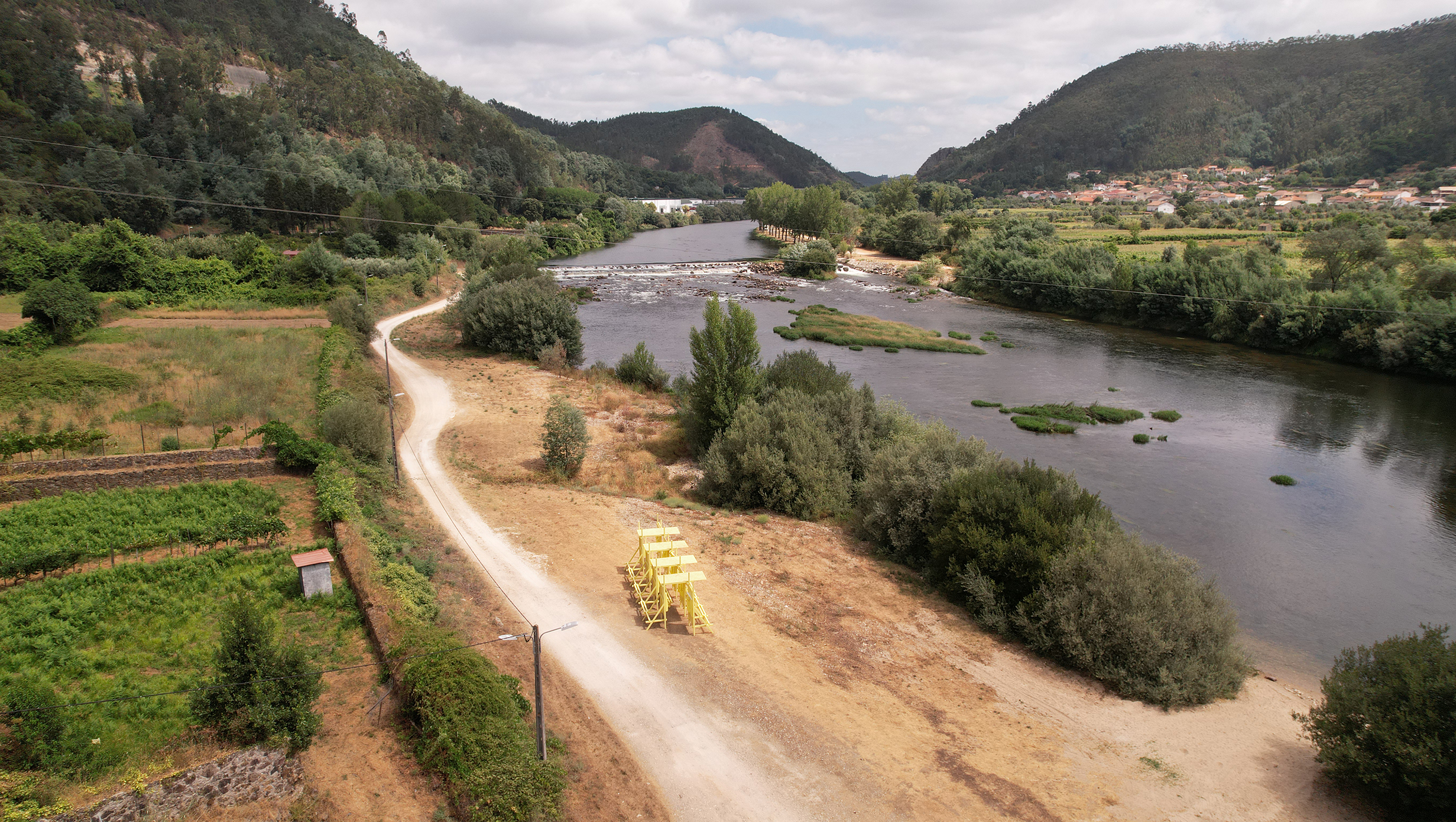 A vertigem das montanhas verdes e a velocidade serena das águas frias do rio, revelam um contexto particular. O perfil é íngreme e quase simétrico, o centro é o Mondego, outrora espaço de deslocação de pessoas e mercadorias raras. As barcas serranas, que aí repousam, falam-nos de histórias longínquas. Hoje é lugar de prazer.Na Praia Fluvial da Ponte convergem os sons da montanha, a textura do rio e a cor da terra, em simultâneo com as histórias que projetamos. À memória, acrescem as razões dos sentidos. Com sessenta barrotes de pinho e treze painéis de OSB, procuram-se novas perspetivas e estabelecem-se relações que não existem. A composição da estrutura, espacial e formal, oferece novos significados à paisagem. Filtra-a e enquadra-a. A luz e as sombras desenham outras geometrias, o chão arenoso acolhe-as. Nós somos um dos seus habitantes. Imaginamos que outros seres façam desta estrutura a sua casa. O Mondego pode-a acolher igualmente como sua...